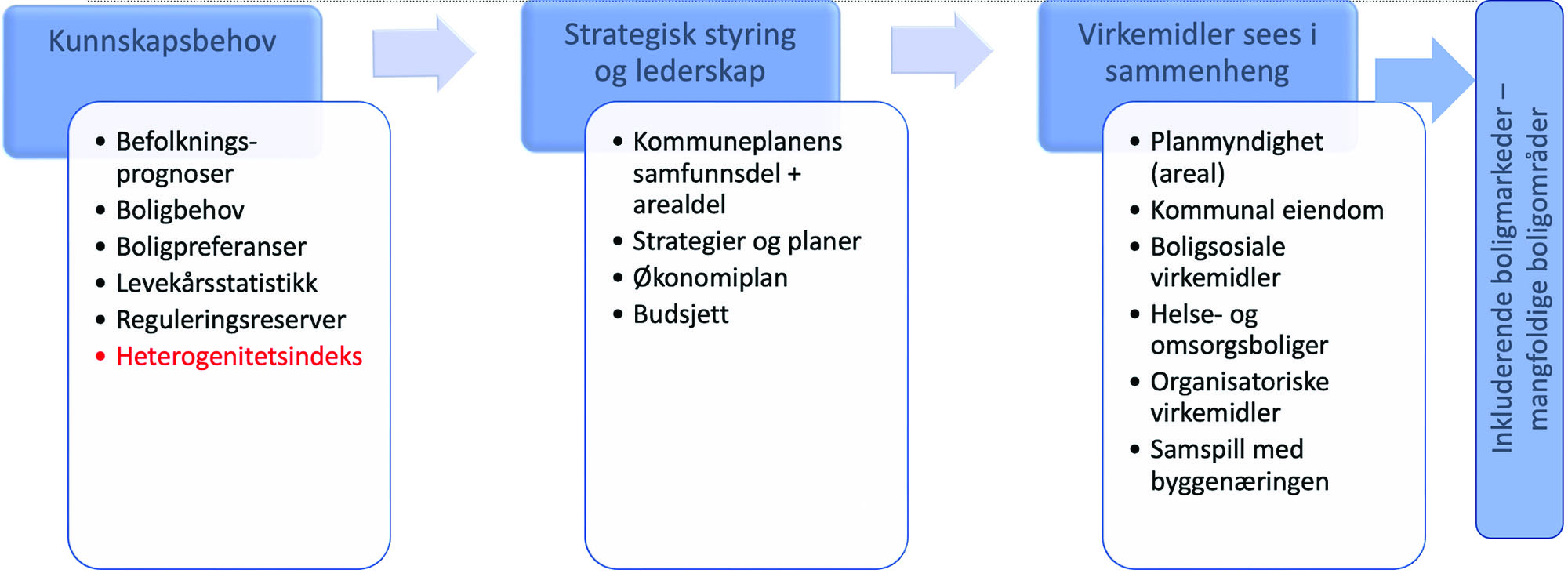 Til forskjell fra våre naboland Sverige og Danmark skjer boligproduksjonen i Norge nesten utelukkende gjennom private eiendomsaktører som planlegger og bygger boliger (Hansson, 2019). Kommunen har likevel en viktig rolle, først og fremst som myndighet i beslutninger om arealbruk og byggesaker. I formålsparagrafen for plan- og bygningsloven (2008) uttrykkes det tydelige forventninger om at kommuner skal ta en mer strategisk styringsrolle gjennom planinstrumentene. Dette kan de gjøre ved å «bestille» større bredde i nybyggingen, og ved å bruke bredden av virkemidler de har for å realisere en boligpolitikk som i større grad gir rom for alle typer hushold i alle områder av kommunen. De er den primære arealmyndighet som skal gi en langsiktig retning for (bolig)utviklingen, de vedtar reguleringer, de har flere boligsosiale virkemidler (støttet av Husbanken), de har organisatoriske virkemidler (tomteselskap, kommunale foretak), og de kan ha kommunal eiendom som virkemiddel (KS, 2018). Barlindhaug et al. (2014b) spør imidlertid om kommunene bruker virkemidlene på måter som bidrar til utjevning og spredning, og om kommunene trenger flere virkemidler for å oppnå dette. Dersom inkluderende boligmarkeder og mangfoldige byområder er et politisk ønske, og kommunen ønsker å unngå hopning av levekårsutfordringer i noen områder og sterk konsentrasjon av høyinntektsgrupper i andre områder, hva trenger så kommunen av kunnskap om boligmasse og boligmarked? Om de ønsker å utøve strategisk lederskap, og se virkemidler i sammenheng, på hvilket kunnskapsgrunnlag skal de bygge sine strategiske beslutninger?