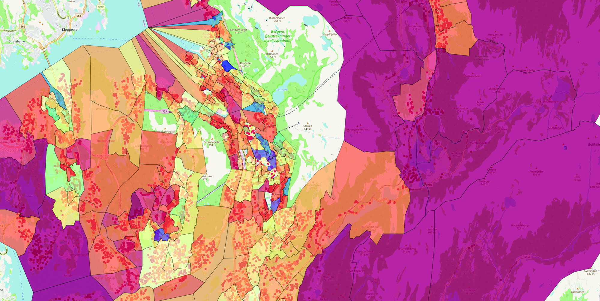 Figur 2 viser et kart over Bergen hvor grunnkretser er farget fra rødt til blått etter gjennomsnittlig boligområde-heterogenitet på grunnkretsnivå. De røde områdene har lav heterogenitet, og blå har høyest heterogenitet. Vi ser at kartet blir litt preget av at grunnkretser i utkanten av byen er store, og at disse er lite heterogene. De mest heterogene områdene finnes i og rundt sentrum. Slik sett kommer de finere detaljene bedre frem ved å zoome inn på mindre og mer sentrumsnære områder.