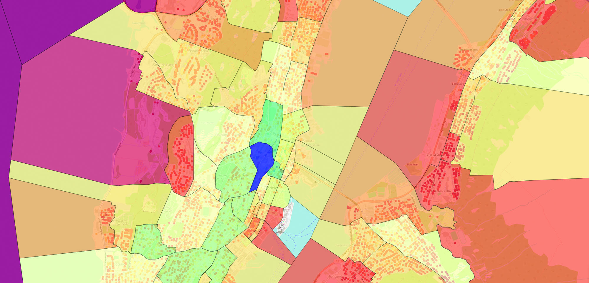 Grunnkretsene er altså farget fra rødt til blått etter gjennomsnittlig boligområde-heterogenitet på grunnkretsnivå. Dette innebærer at de røde områdene har lav heterogenitet, og blå har høyest heterogenitet. For Tromsø ser vi at det er de sentrale byområdene på Tromsøya som er blå og grønne og dermed har høyest boligmasseheterogenitet. Her finner vi altså størst variasjon i boligmassen, mens områder med sterk rød farge er mer homogene. Variasjonen vi her ser illustrert for grunnkretsene, er altså knyttet til boligmassens sammensetning. Illustrasjonen kan dermed bidra til viktig informasjon for beslutningstakere i kommunen, som er planmyndighet, og til private utbyggeraktører som ofte er initiativtakere til nye boligprosjekter.
