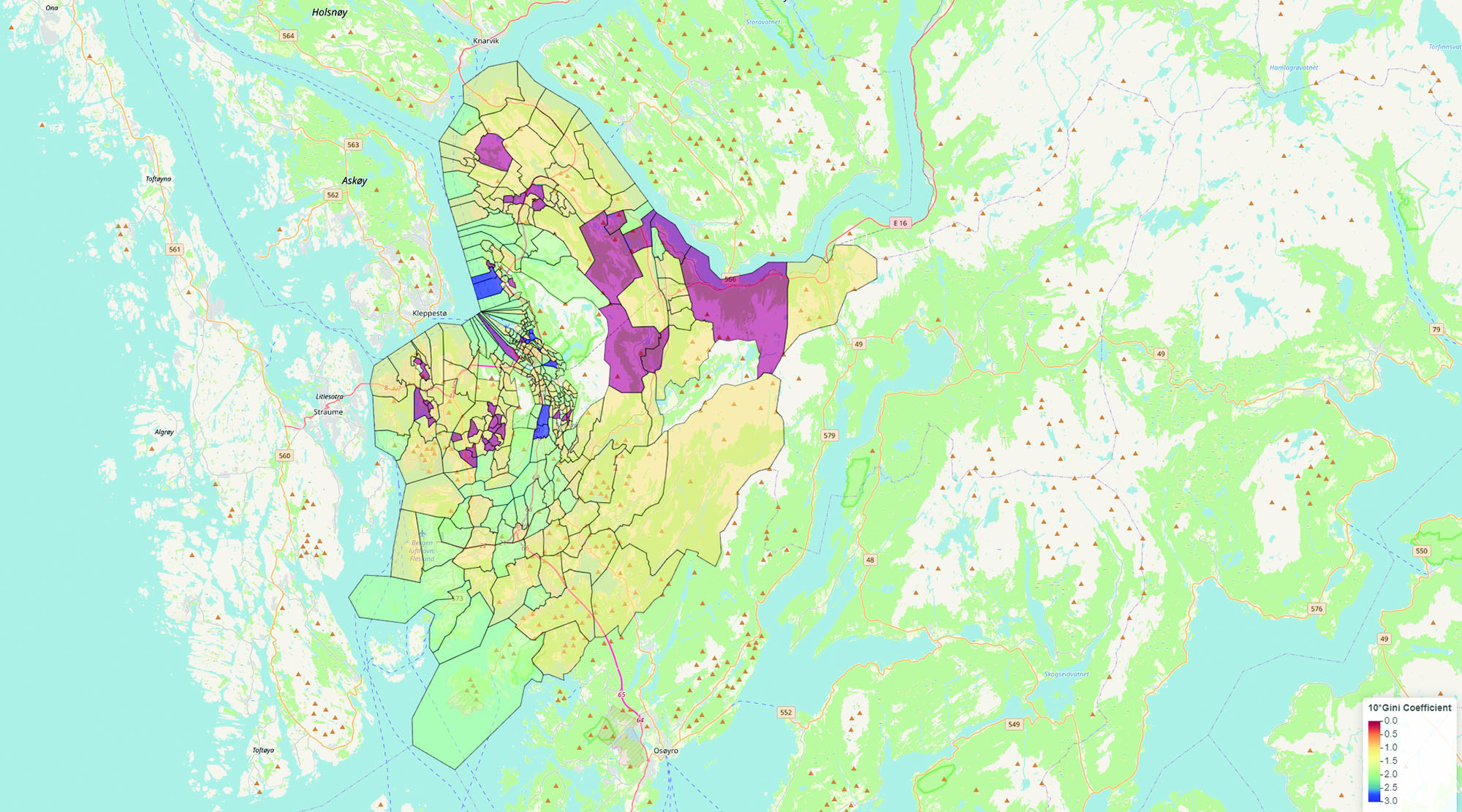 Her ser vi tydeligere hvordan Gini-koeffisienten er for ulike grunnkretser i kommunen, hvor altså det blå feltet og de grønne feltene indikerer områdene hvor det er størst prisvariasjon.