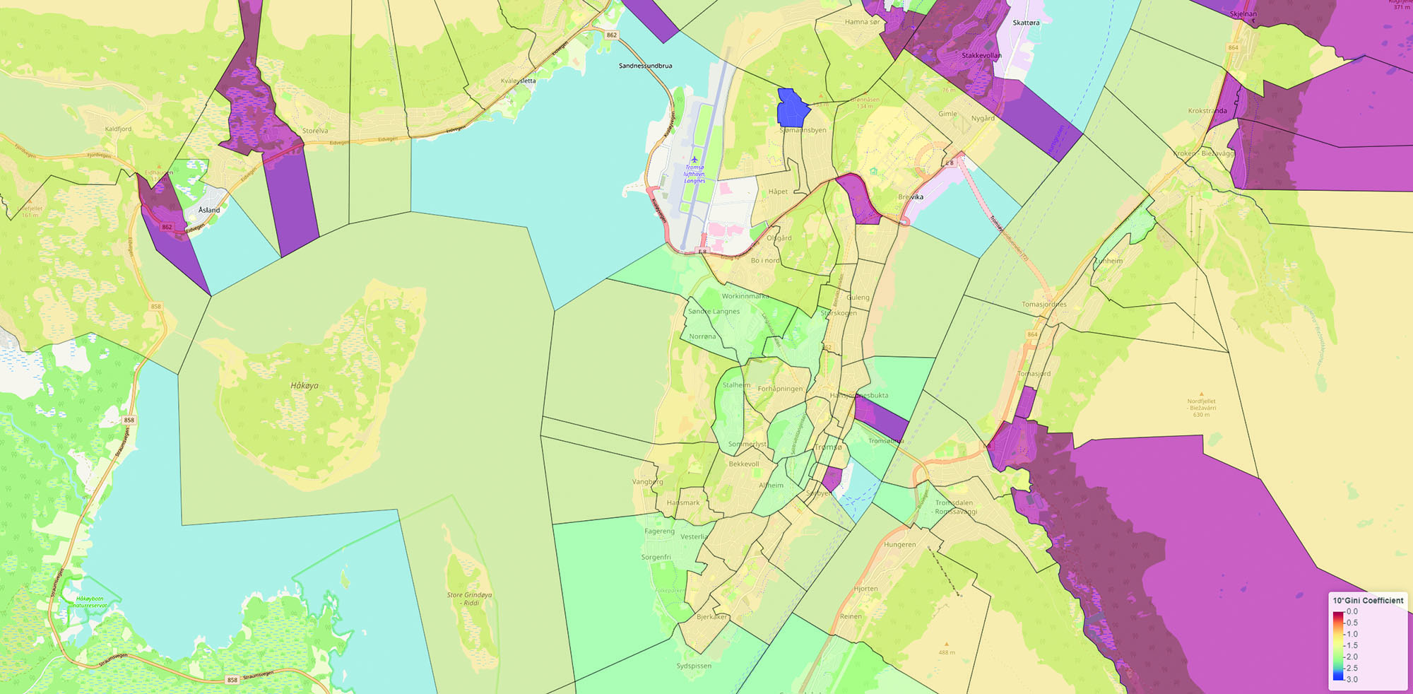 Gini-koeffisientene for pris for et utsnitt av Tromsø-kommune.