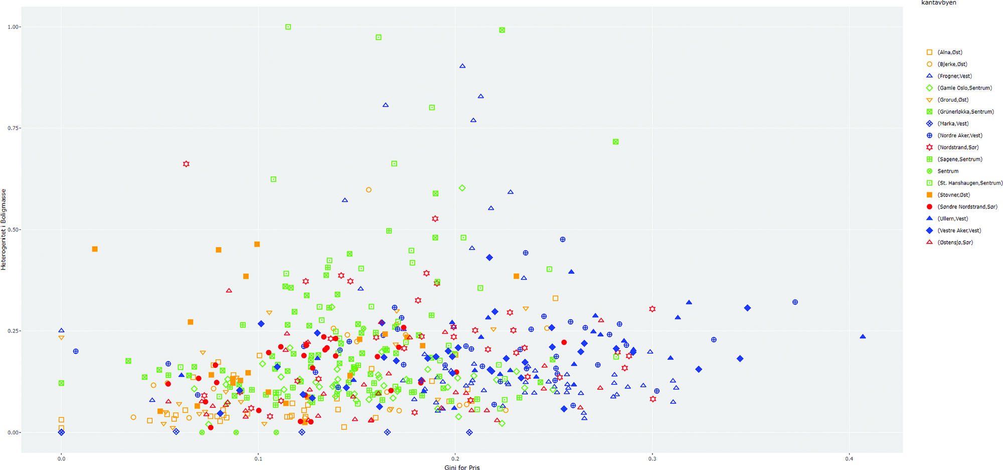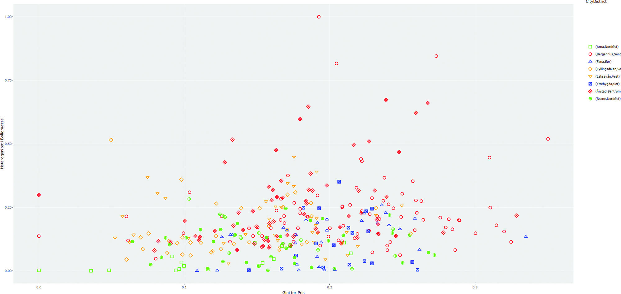 Boligmasseheterogenitet og Gini for pris i ulike byområder i Bergen.