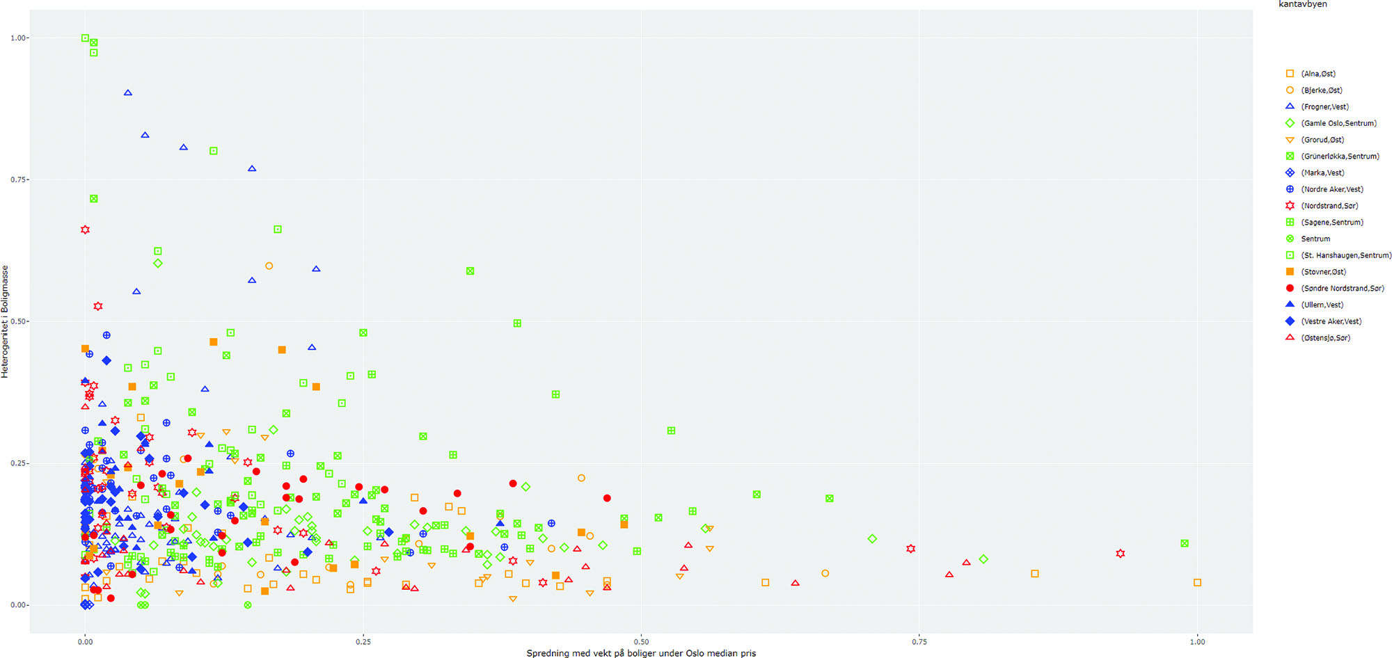 Vår boligmasse-heterogenitetsindeks inneholder naturlig nok ikke boligpris. Samtidig er det opplagt at boligpris er av stor betydning for boligsøkere. Det er flott at et bo-område har boliger for enhver smak og livsfase, men det hjelper lite dersom alle boligene er (for) dyre. Derfor er boligpris en interessant dimensjon i seg selv og sett i sammenheng med vårt heterogenitetsmål.
