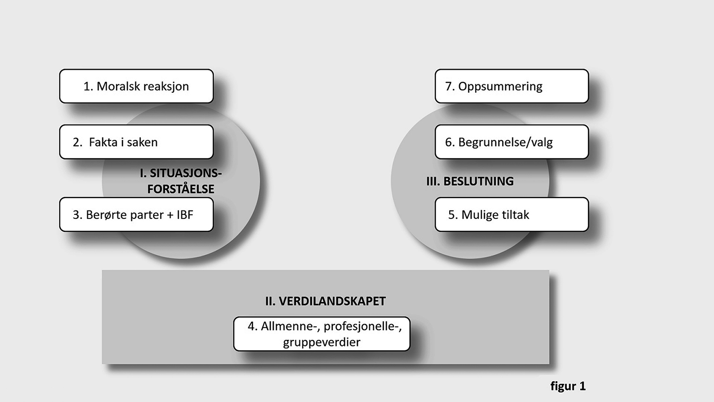 Syvtrinns-modellen som presenteres her har blant annet røtter tilbake til Deweys beslutningsteoretiske refleksjoner (Dewey, 1910, s. 72), bruken av «warrants» hos Toulmin (1958, kap. iii) og Potters (1965) terrorbalanse-dilemmaer. I Norge har helsetjenestens kliniske etikkomiteer anvendt en slik metodikk siden 1990-tallet (Paulsen, Førde & Pedersen, 2011; Ruyter, Førde & Solbakk, 2014). Såkalt «Values-based practice» benyttes innenfor flere fagfelter i England (Loughlin, 2014), og britiske College of Policing (2014) benytter en verdibasert beslutningsmodell. Lignende metoder foreslås i svenske, danske og norske lærebøker (Diderichsen, 2011; Heivoll & Aadland, 2018; Knutsson & Granér, 2001). Varianten som foreslås her er utviklet i undervisning ved Politihøgskolen i Oslo siden 2012. Denne fremhever i større grad verdienes funksjon som basis for tiltak og etikkteorienes rolle i begrunnelsen av handlingsvalg. Trinnene inngår også i en modell snarere enn en ren sekvens. De syv trinnene (1–7) kan sorteres i følgende tre deler (I–III):