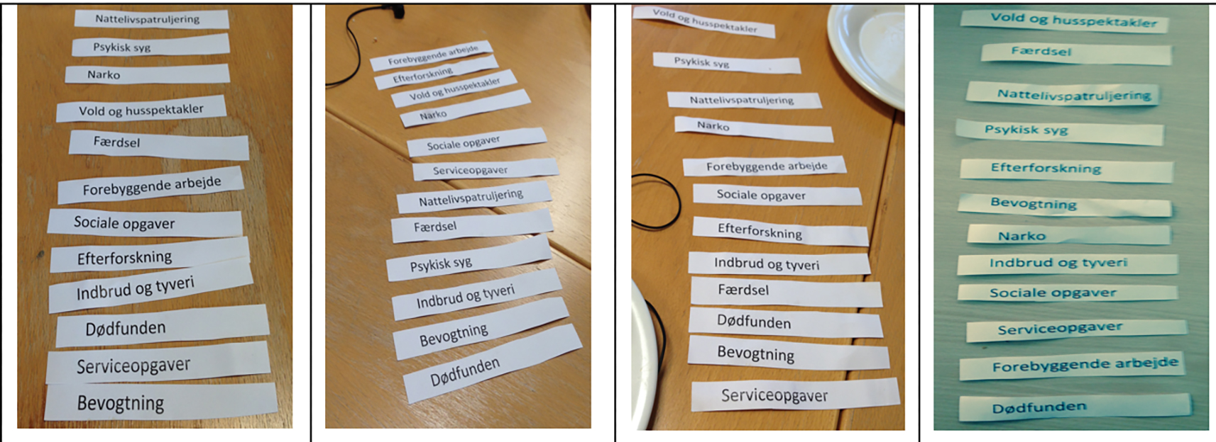 Selve fokusgrupperne er afholdt som semistrukturerede interviews (jf. Staunæs & Søndergaard, 2005, s. 53). En stor del af interviewene har forløbet ved, at de enkelte grupper i fællesskab har løst en opgave, hvor de sammen skulle rangere tolv forskellige typer af politiopgaver, i forhold til hvor attraktive de fandt dem ud fra en helhedsvurdering, som inddrager de kriterier, der er relevante for deres vurdering. Som Figur 1 illustrerer, varierer det meget, hvor relevante og afgrænsede de tolv opgaver fremstår. Nogle er mere eller mindre konkrete opgaver, der ofte dukker op i hverdagens beredskab (såsom ”Indbrud og tyveri”), hvor andre beskriver et helt overordnet arbejdsområde, og mange af dem kan forstås som begge dele. Nogle af opgavetyperne (såsom ”Narko” og ”Efterforskning”) er så brede og uklare, at de kan overlappe med de fleste af de andre typer af opgaver. Denne uklarhed var tilsigtet, da den tvang informanterne til selv at sætte ord på, hvad de forstår ved de forskellige opgaver, og i hvilken udformning den ville være attraktiv for dem. Formålet med rangeringsopgaven har ikke som sådan været at afdække deres prioritering af opgaverne, men snarere at undersøge, hvilke ord og værdier de knyttede til de forskellige opgaver under diskussionen.